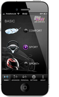 Wahl zwischen den KW Dämpfermodi „Comfort“, „Sport“ und „Sport+“ – die beiden „Sport-Modi“ können auch mit individuellen Einstellungen über das ADVANCED Menü belegt werden.