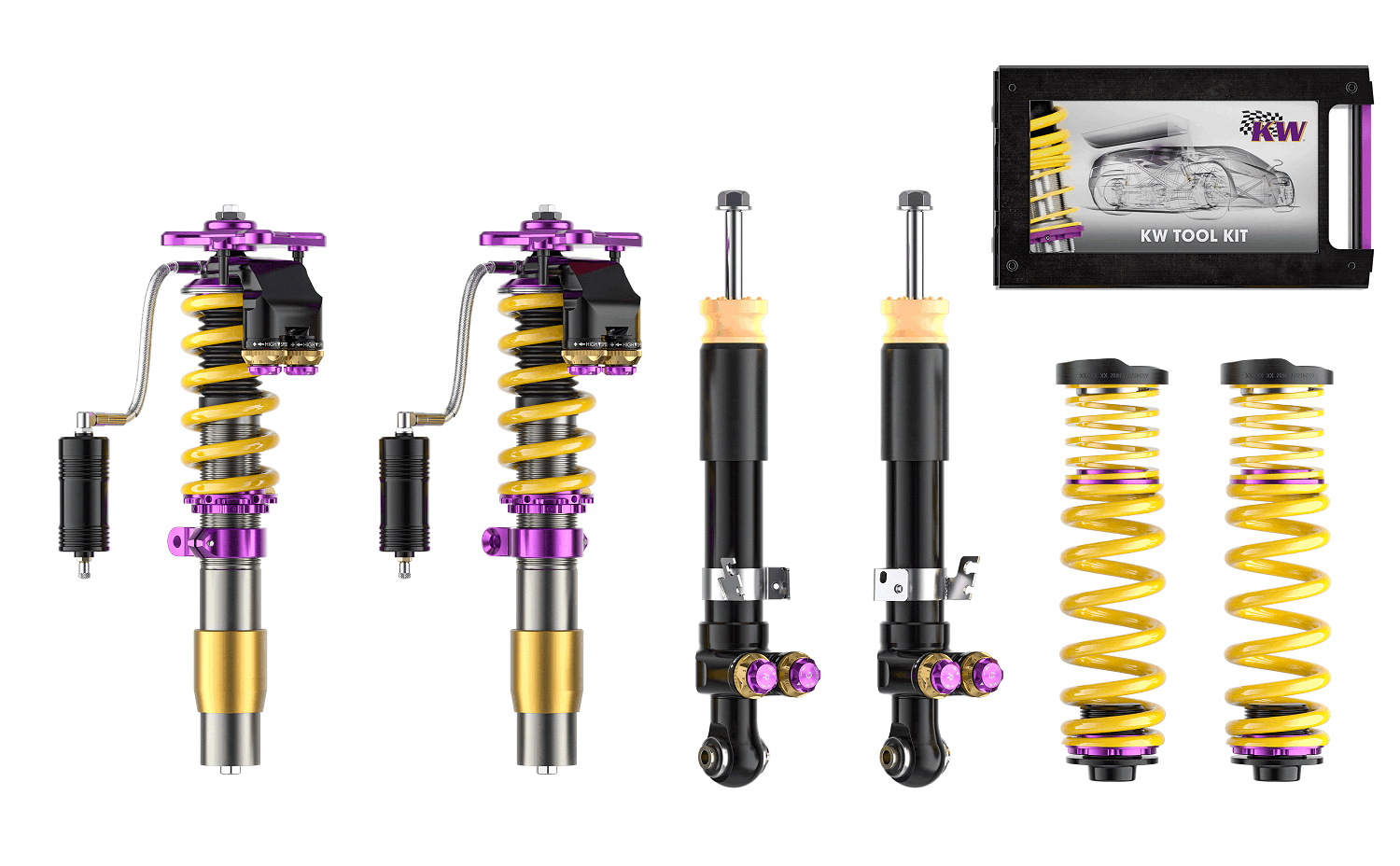 Die in Serie mit verschiedenen Ventilfedertypen und Hauptventilen aufgebauten Low- und Highspeed-Ventileinheiten im KW V5 Clubsport bieten die Freiheit, die Druckstufen- und Zugstufendämpfung individuell mit jeweils 13 exakten Klicks (14 Kennlinien) im Lowspeed- sowie Highspeedbereich abzustimmen. Auch kann durch die KW Verdrängertechnologie (KW Solid Piston Technology) ein großer Kraftbereich bei der Kennliniengestaltung abgedeckt werden; umso eine völlig neue Art einer harmonischen Dämpfung zu ermöglichen.