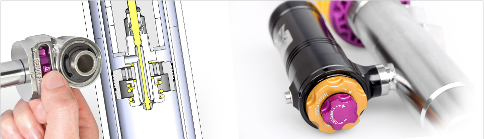 Auch der Herausforderung der Anbindung an ein ab Werk verbautes elektronisches Regelsystem, kann die KWautomotive die führende Solid Piston Technologie anbieten. Hier werden in die Ventilsitze Proportionalventile eingesetzt welche die Dämpfkraft regeln und steuern.
