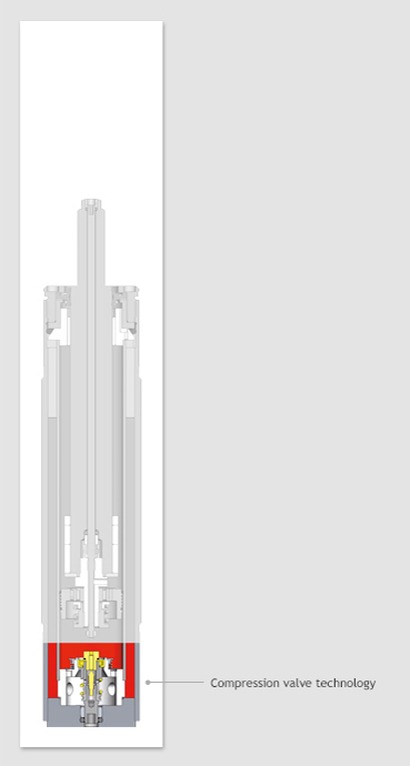 Die Low-Speed Dämpfung dieser Technik ermöglicht eine gleichbleibende maximale Druckdämpfung. Die (sicherheitsrelevante) Abstützung des Fahrzeuges im High-Speed Bereich der Dämpfung wird bei geöffneter und geschlossener Druckstufe nicht beeinflusst und gewährleistet.
