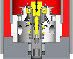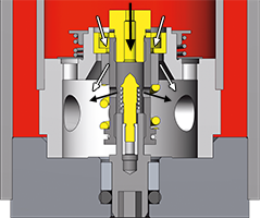 Die max. Druckdämpfung (weiße Pfeile) erfolgt über das federbelastete Kolbenventil Durch das geöffnete Bypassventil wird eine degressive Kennlinie der Druckdämpfung im Low-Speed Bereich erzielt