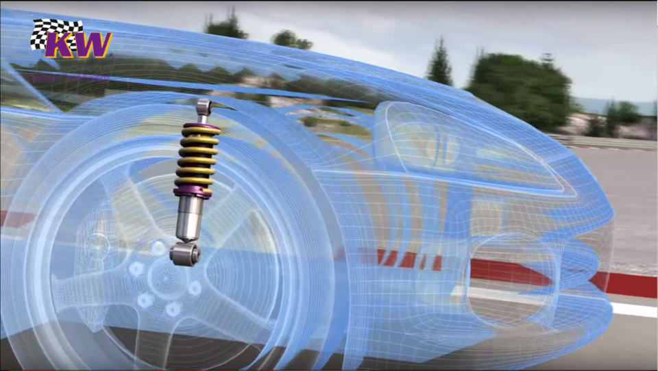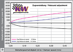 Der Dämpfer eines Fahrwerks wandelt die Bewegungsenergie der Fahrwerkfeder in Wärmeenergie um und strahlt sie an die Umwelt ab. Wird eine Kurve gefahren, arbeitet das KW Gewindefahrwerk in der Kurveninnenseite des Fahrzeugs in der Zugstufe und die kurvenäußeren KW Dämpfer in der Druckstufe.