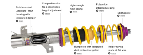 Die KW Gewindefahrwerke der Variante 3 „inox-line“ und der KW Clubsport Serie sind das ideale Zubehör für Performance-orientierte Autofahrer und Tuningenthusiasten, die bei ihren Fahrzeugen einen großen Anspruch auf Sportlichkeit legen.
